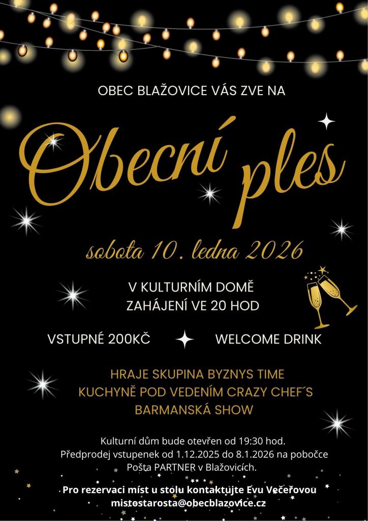 Obecní ples se uskuteční v sobotu 10. ledna 2026 v kulturním domě. Otevření sálu proběhne v 19:30 hod., oficiální zahájení ve 20:00 hod.. K tanci i poslechu zahraje skupina BYZNYS TIME. Pro návštěvníky je připraven welcome drink, skvělá kuchyně pod vedením CRAZY CHEF’S, profesionálně míchané nápoje, barmanská show, bohatě zásobený bar a tradičně krásně vyzdobený sál. O půlnoci proběhne oblíbená hra o ceny.