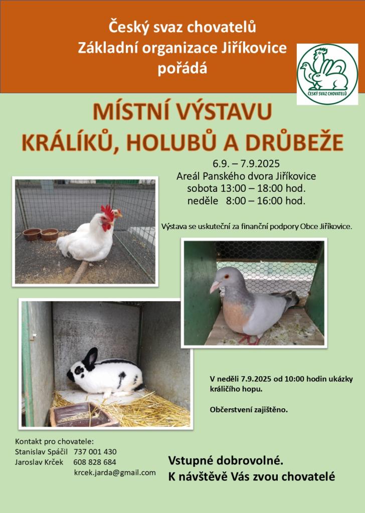 Český svaz chovatelů, základní organizace Jiříkovice vás zve na chovatelskou výstavu v Jiříkovicích ve dnech 6. - 7.9.2025. V neděli budou ukázky králičího hopu.