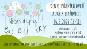 Den otevřených dveří a zápis do Dětské skupiny Bublinky proběhne 26. 5. 2026 od 16:00 do 18:00.