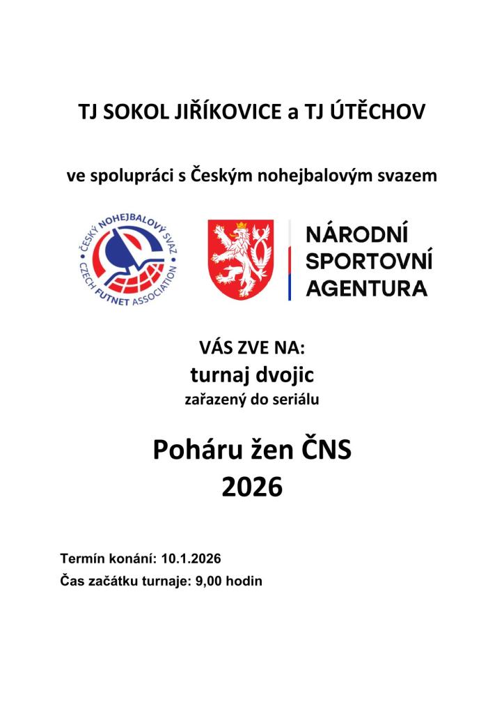 TJ Sokol Jiříkovice vás zve 10.1.2026 na nohejbalový turnaj žen, který se koná ve sportovní hale v Jiříkovicích.